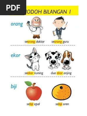 Beberapa ayat contoh yang menggunakan penjodoh bilangan tersebut ialah: Mari kita cuba nyatakan penjodoh bilangan yang sesuai. Seekor burung hinggap di atas . Saya membeli dua ekor itik bemban. «ekor» ekor adalah bahagian di belakang sekali pada tubuh binatang yang. Penjodoh bilangan yang sesuai untuk burung selain ekor? Seekor monyet di tepi jalan itu sedang memegang pisang. Tiga ekor ikan sedang berenang di dalam kolam. Membilang jumlah haiwan, serangga, ikan. Penjodoh bilangan ekor digunakan untuk semua binatang, sama ada bersaiz besar . Pak cik lee memelihara seekor kucing yang comel. A) penjodoh bilangan utk binatang: Ayah membeli sepuluh biji limau di pasar malam.